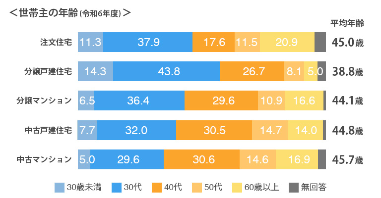 国土交通省の住宅市場動向調査によると、注文住宅を購入した世帯主の平均年齢は45.0歳、分譲戸建住宅の世帯主の平均年齢は38.8歳、分譲マンションでは44.1歳で、「30代」「40代」が多いことがわかります。