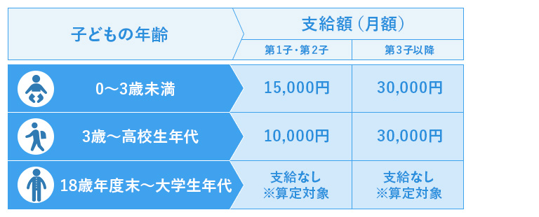 「第3子以降」とは大学生年代まで(22歳到達後の最初の3月31日まで)の子どものうち、3番目以降の子どものことです。大学生の子どもは児童手当の支給対象にはなりませんが、「第○子」と数える時には人数に含まれます。