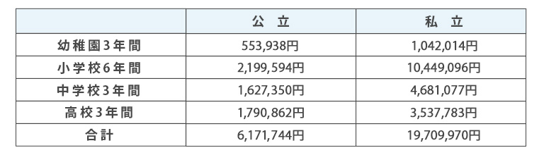 幼稚園から高校卒業まですべて公立に行った場合の合計金額は約617万円、すべて私立に行った場合は約1,970万円かかることになり3倍以上の差があります。小学校だけで見ると公立と私立の差は約5倍違ってきますし、中学校では約3倍、高校では約2倍となっています。実際にはすべて公立・すべて私立に通うとはかぎりませんが、進学先によってそれだけ違いがあることを知っておきましょう。